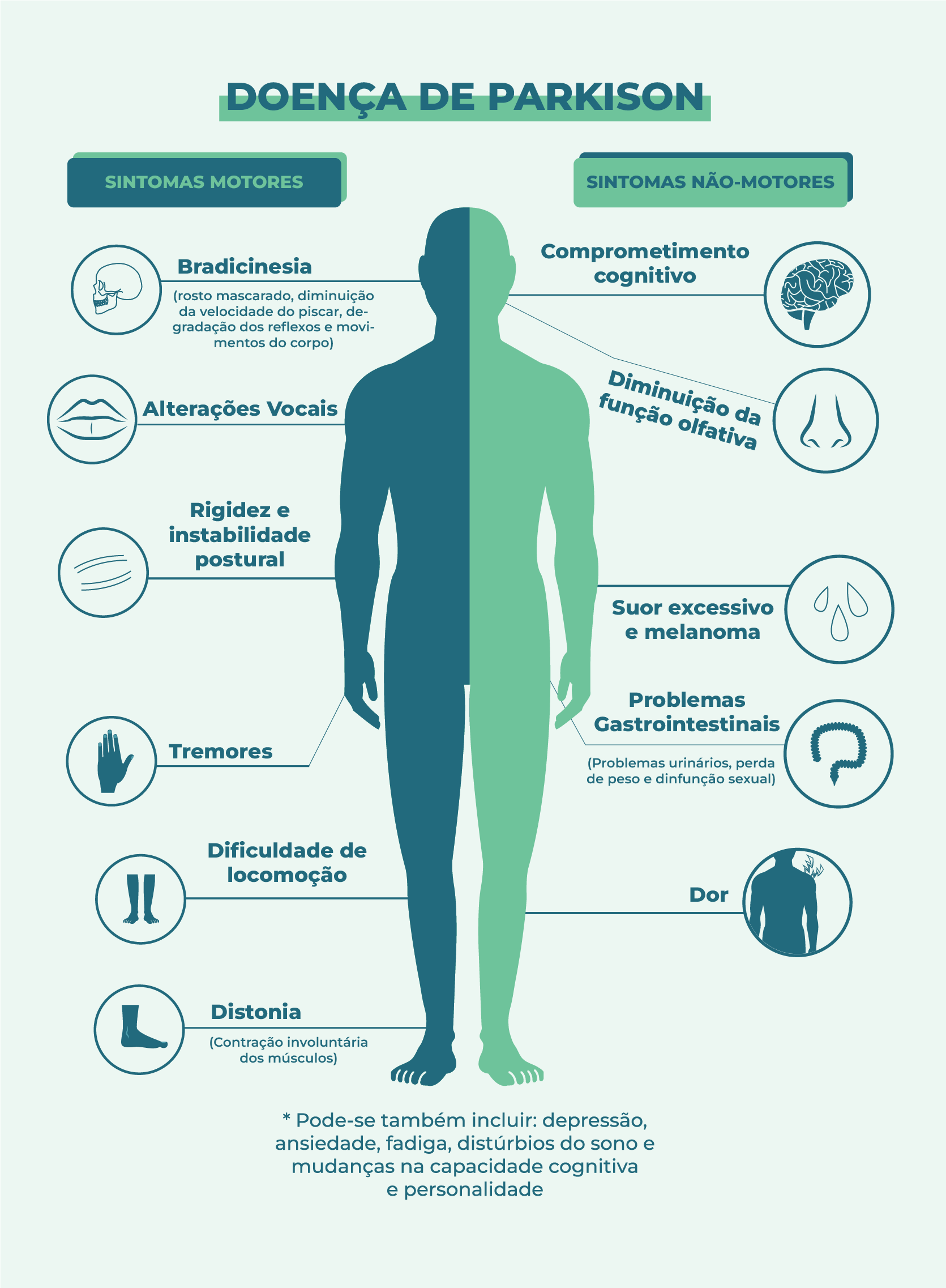 Os sintomas descritos acima, são os mais observados e são determinantes para diagnóstico, porém a Doença de Parkinson pode causar muitos outros sintomas motores e inclusive não-motores ao paciente, como mostra na figura abaixo: